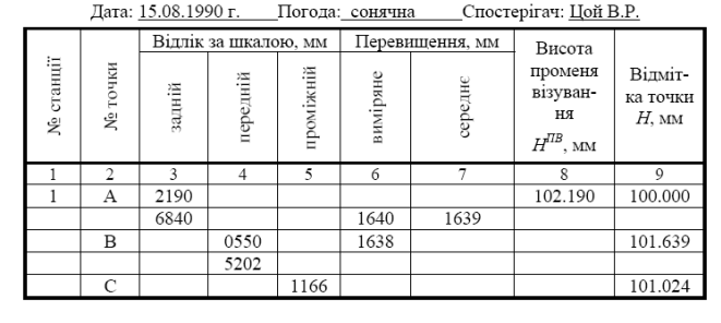 В журналі технічного нівелювання (рис. 13) фіксують номер станції (1), задньої (А), передньої (В) і проміжної (С) точок.