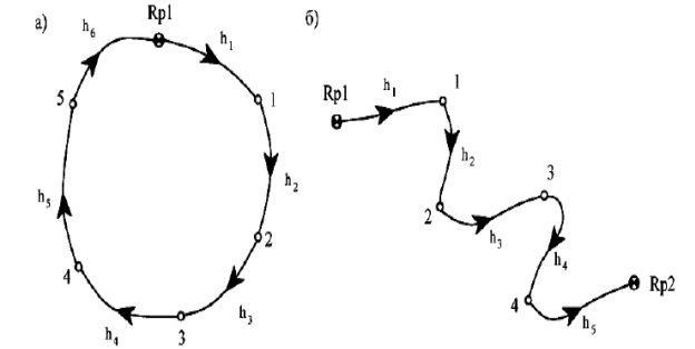 6. Висотні ходи зйомочної основи проектують за точками теодолітного ходу з прив’язкою кінцевих точок до марок і реперів державної геодезичної мережі або мережі згущення (рис. 14). Вимірювання перевищень між точками виконують методом геометричного або тригонометричного нівелювання.