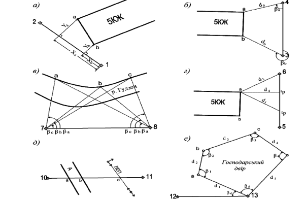Рис.Способи теодолітного знімання. а – спосіб перпендикулярів; б – полярний спосіб; в – спосіб кутових засічок; г – спосіб лінійних засічок; д – спосіб створів; е – спосіб обходу.