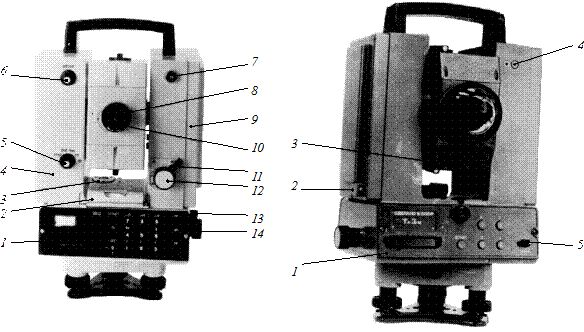 1 - цифрове табло; 2 - циліндричний рівень; 3 - круглий рівень; 4 - перемикач режиму роботи; 5 - регулювання сигналу; 6 - окуляр; 7, 8 - пристрій точного візування зорової труби; 9, 10 - пристрій точного орієнтування приладу; 11 - табло горизонтального кута; 12 - оптичний візир