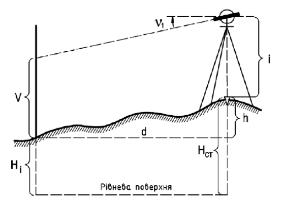 При тахеометричному зніманні визначають планове і висотне положення точок місцевості відносно пунктів зйомочної основи. Планове положення визначають полярним способом, а висотне – тригонометричним нівелюванням (рис.).