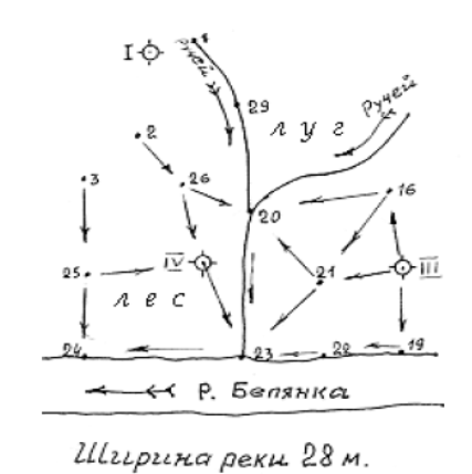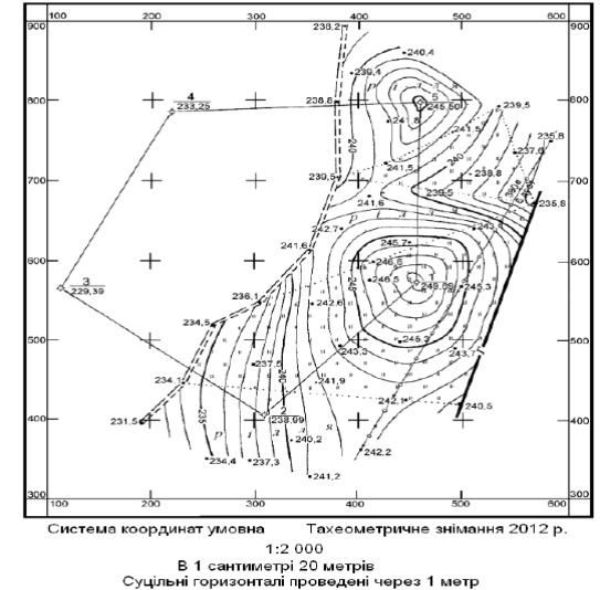3. Цифри записують чітко, щоб вони легко читались; прямі лінії викреслюють під лінійку; криві – старанно від руки. На краях ситуації роблять пояснювальні написи.