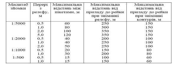 В горбистій та гористій місцевостях, знімання рельєфу бажано проводити знизу догори, від рівня води, з підошви схилів. Закінчувати знімання слід на вершинах схилів та на водороздільних лініях. Всі дані спостережень на пікетні точки (відліки з віддалемірних ниток, відлік з горизонтального круга, відлік з вертикального круга, висота наведення середньої нитки) заносяться в журнал тахеометричного знімання. При зніманнях у масштабі 1:500, максимальна відстань між пікетними точками допускається не більше 10 м; максимальна відстань від приладу до рейки: при зніманні рельєфу – 100 м, при зніманні твердих контурів – 60 м, при зніманні нетвердих контурів – 80 м.