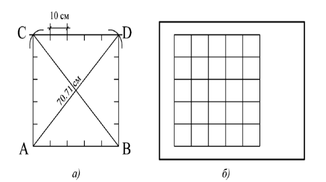 Лінійкою з точки В радіусом R =70.71 см роблять засічку по штриху і отримують точку С. Кут САВ = 90°, а відповідні відстані – LAB = 50 см, а LAC = 50 см. Так само з точок В і А визначають положення точки D. Отримують чотирикутник АВСD.