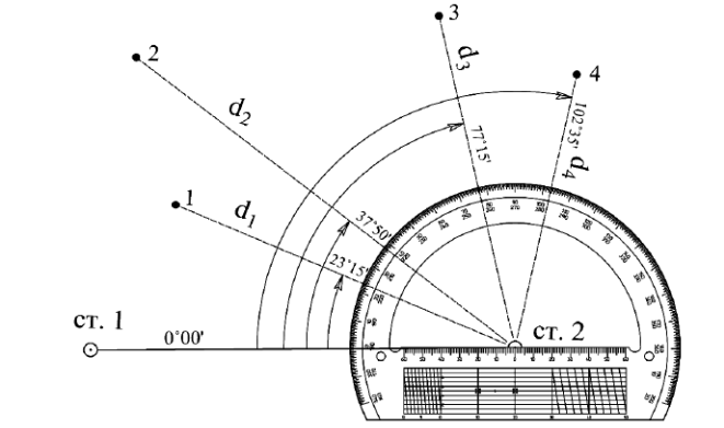 4. Нанесення ситуації. Нанесення точок тахеометричного знімання виконують за допомогою лінійки і геодезичного транспортира. Центр транспортира сполучають зі станцією знімання. Нульову поділку орієнтують на вихідний напрямок. Відраховують виміряний при зніманні горизонтальний кут між вихідною лінією і напрямком на точку тахеометричного знімання (рис. 11) і вздовж отриманого напрямку в масштабі плану відкладають горизонтальнее прокладення d за допомогою лінійки. Таким чином отримують положення шуканої точки. Підписують її номер і відмітку.