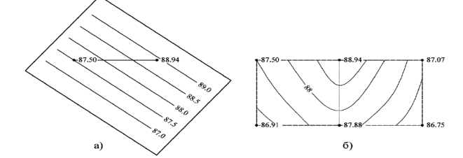 Накладають палетку на точки плану і розвертають так, щоб вони знаходились на відповідних відмітках (рис. 12 а). На перетині лінії, якою з’єднані точки з підписаними лініями палетки, отримують відмітки горизонталей. Таким чином визначають положення горизонталей між усіма суміжними точками. Точки з однаковими відмітками з’єднують плавними кривими лініями – горизонталями (рис. 12 б).