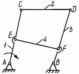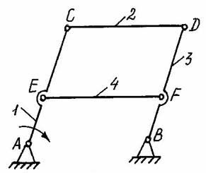 Например, в механизме, показанном на рис. 1.3, а, при наличии звена EF степень подвижности W = 3n - 2p5 - p4 = 3*4 - 2*6 - 0 = 0, но если принять дополнительное условие, касающееся размеров звеньев, а именно AB =º CD =ºEF (рис. 1.3, б) то, несмотря на то, что по подсчету по прежнему W = 0, фактически степень подвижности W = 1 и механизм будет работать. При этих условиях звено EF можно исключить и степень подвижности не изменится. Такие звенья, наличие которых не влияет на подвижность механизма, налагают пассивные или избыточные условия связи и называются пассивными. В механизмы они вводятся для увеличения жесткости, лучшего распределения нагрузки, создания определенности направления движения и т.д. Введение пассивных звеньев требует высокой точности выполнения элементов кинематических пар.