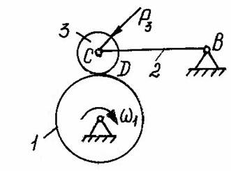 В механизме на рис. 1.3, в, W = 3n - 2p5 - p4 = 3*3 - 2*3 - 1 = 2. Вторую подвижность вносит звено 3 - некруглый ролик. Если ролик сделать круглым (рис. 1.3, г), то характер относительного движения коромысла 2 будет таким же, как и в том случае, если ролик сделать неподвижным. В этом смысле степень свободы, вносимая роликом, является "лишней". При закрепленном ролике n = 2, p5 = 2, p4 = 1 и W = 3*2 - 2*2 - 1 = 1.