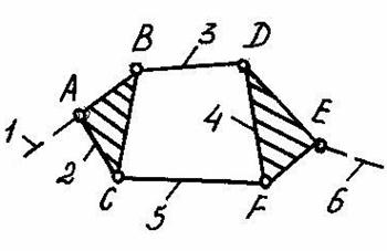 Контур и вид группы. Группы делятся на классы в зависимости от класса контура. Контуром называют замкнутую часть плоскости, занятую звеном или ограниченную со всех сторон звеньями. Класс контура определяется числом кинематических пар, входящих в этот контур. Контур, изображенный на рис. 1.5, б - второго класса (эквивалентное изображение дано на рис. 1.5, в). На рис. 1.5, д изображена группа, в состав которой входят три контура: АВС - контур третьего класса, BDFC - контур четвертого класса, DEF - контур третьего класса.