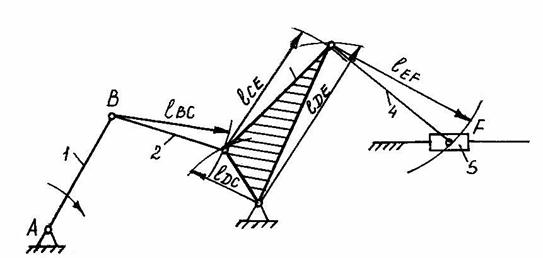 Механизм конвейера состоит из пяти подвижных звеньев (n = 5) и семи кинематических пар пятого класса (р5 = 7); пары четвертого класса отсутствуют (р4 = 0). Степень подвижности цепи по формуле W = 3n - р5 - р4 = 3*2 - 2*7 - 0 = 1, следовательно, эта цепь будет механизмом при заданном законе движения одного звена (звено 1). В механизме пассивных связей и лишних степеней свободы нет.