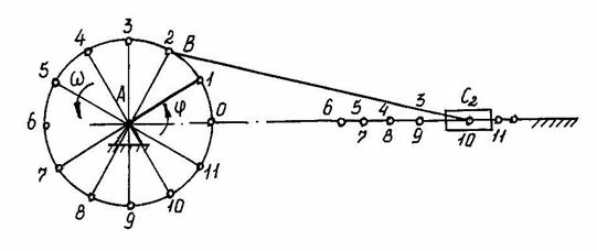 При вычерчивании плана положений механизма прежде всего нужно нанести положения неподвижных центров вращательных пар и направляющих поступательных пар. Затем, для выбранного положения ведущего звена последовательно определяются положения кинематических пар и звеньев групп, присоединенных к ведущему звену.