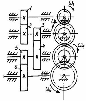 Определим передаточное отношение рядового механизма, состоящего из трех пар цилиндрических зубчатых колес (рис. 3.3, а). Колеса 2-3 и 4-5 жестко связаны между собой, т.е. вращаются с одинаковыми угловыми скоростями (w2 = w3; w4 = w5). Общее передаточное отношение механизма: