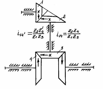 Для рядовых механизмов с коническими колесами знак передаточного отношения определяется по правилу стрелок (рис. 3.3, в): при одинаковом направлении стрелок, определяющих направление вращения колес, знак положительный, при противоположном - отрицательный.