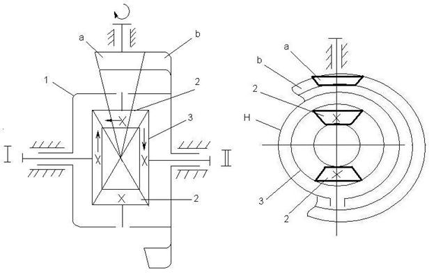На рис.3.6. представлена схема дифференциала автомобиля. От ведущего вала через коническую передачу a-b приводятся во вращение водило H, в котором смонтированы сателлиты 2 и