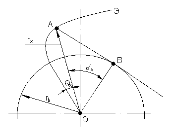 Если по окружности перекатывается без скольжения прямая AB (рис.5.2) то любая точка этой прямой описывает эвольвенту Э, часть которой принимается в качестве кривой, очерчивающей рабочую часть профиля зуба. Окружность радиуса