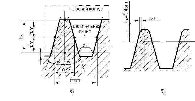 На основании исходного контура строится рабочий контур, совпадающий с очертанием впадин исходного контура (рис. 5.5, а) и служащий для проектирования зуборезного инструмента.