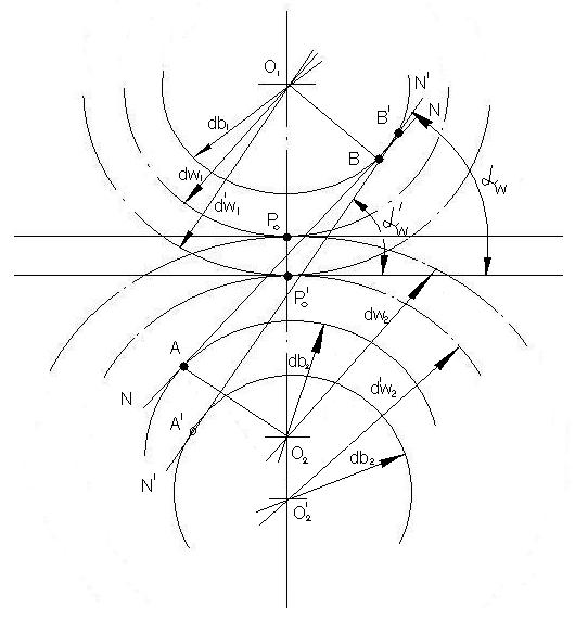 Рис. 5.6. К вопросу об изменении межцентрового расстояния двух колёс с эвольвентным зацепление.