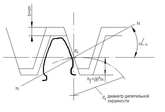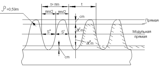При нарезании стандартного зацепления модульная прямая должна без скольжения перекатываться по начальной окружности нарезаемого колеса, и в этом случае толщина зуба и ширина впадины нарезаемого колеса как из рейки, равны между собой.