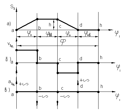 Рис. 6.3. Закон движения ведомого звена кулачкового механизма: а) диаграмма пути; б) диаграмма аналога скорости; в) диаграмма аналога ускорения.