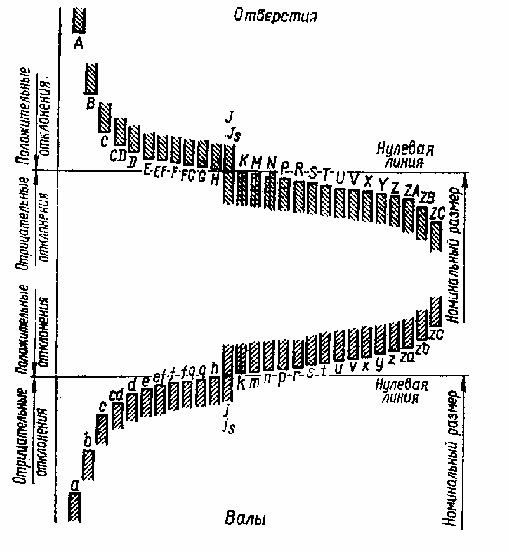 Расположение поля допуска относительно нулевой линии принято обозначать буквой (или двумя буквами) латинского алфавита - прописной для отверстий и строчной для валов (рис. 7.2).