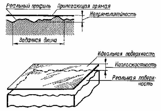 Точность геометрической формы. К отклонениям формы деталей по ГОСТ 24642-81, имеющих плоские сопрягаемые поверхности, относятся непрямолинейность и неплоскостность (рис. 7.4). Под непрямолинейностью понимается отклонение от прямой линии профиля сечения поверхности плоскостью, нормальной к ней, в заданном направлении. Неплоскостность - отклонение от прямолинейности в любом направлении по поверхности, например выпуклость, вогнутость.