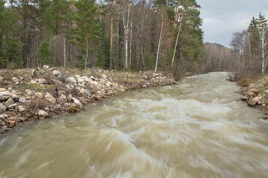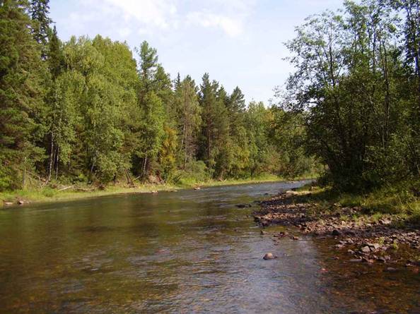 Согласно гидрологическому справочнику, пойма верхнего участка реки, находящегося в пределах заповедника, на протяжении 27 км от истока прослеживается редко, при этом ширина ее не превышает 100 – 200 м. Ниже пойма двухсторонняя, прерывистая. Ниже 44-го километра от истока на пойме встречаются протоки шириной 2-5 м и старицы длиной 50-100 м, шириной 5-10 м и глубиной 0,5 м. На участке реки в пределах заповедника имеются около 50 островов разных размеров. Глубины на перекатах колеблются от 10 до 15 см на плесах – от 0,7 до 3,7 м. Скорости течения 0,1-2 м/сек. Средний расход воды реки за год составляет около 9 м/сек., средний годовой модуль стока – 9,6 л/сек км. (Ресурсы поверхностных вод СССР. Т.11., 1973.). (рис.16, 17).