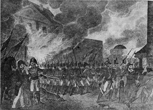 Описывая происшедшие события, российский посланник А. Я. Дашков сообщал 1(13) сентября 1814 г.: «Агличане, поднявшись вверх по р. Патуксен на лодках, высадили 23-го числа прошедшего месяца в 30 милях от Вашингтона около 4 тыс. войска, из коих гораздо менее половины пошли к городу. Для сопротивления им у президента находилось около 1,5 тыс. солдат и около 5 тыс. милиции. Балтиморские волонтеры и одна артиллерийская рота встретили агличан близ деревни Бладенсбург, 6 миль от Вашингтона. Агличане, несмотря на их батарею и стрелков, в лесу и за домами рассыпанных, прошли все малые посты и пошли к Вашингтону, не останавливаясь. Балтиморцы рассеялись, артиллерия ускакала, а милиция разбежалась» 117. Заняв Вашингтон 24—25 августа 1814 г., англичане сожгли Капитолий, Белый дом и другие правительственные здания, а затем благополучно вернулись на свои суда.