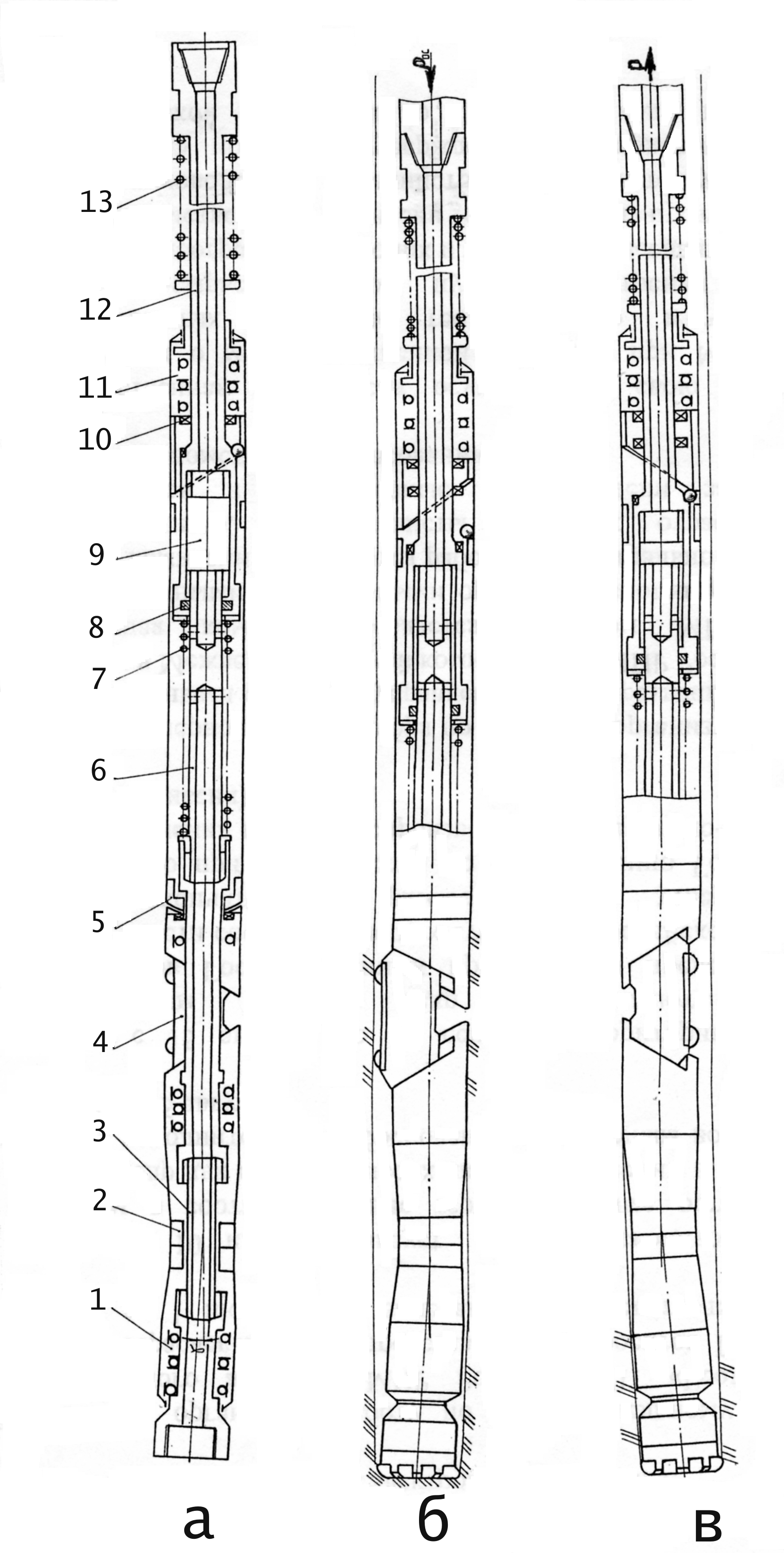 Для ориентирования (рис. 9.11, в) отклонитель «Кедр» следует припод-нять на 0,2–0,5 м над забоем, при этом клиновой ползун втягивается в габариты корпуса. Зафиксированный в апсидальной плоскости шарик, взаимодействуя с винтовой поверхностью стакана ориентирующего устройства, обеспечивает поворот и установку отклонителя в заданное положение. При подъеме отклонителя над забоем разделительное кольцо 8 вновь разъединяет осевые каналы лицевого вала, что также сопровождается кратковременным повышением давления промывочной жидкости, а затем возвратом давления до рабочих параметров. Последовательное повышение и снижение давления промывочной жидкости при подъеме отклонителя над забоем скважины свидетельствует об окончании процесса ориентирования. После получения сигналов об ориентации отклонителя и постановки его на забой создается рабочая осевая нагрузка, включается вращатель бурового станка и производится бурение скважины. Асимметричное разрушение забоя скважины и её искривление осуществляются за счет наклона оси породоразрушающего инструмента к оси скважины. При бурении рекомендуются осевая нагрузка 8,0–30,0 кН; частота вращения не более 600 мин-1; расход промывочной жидкости 30 л/мин.