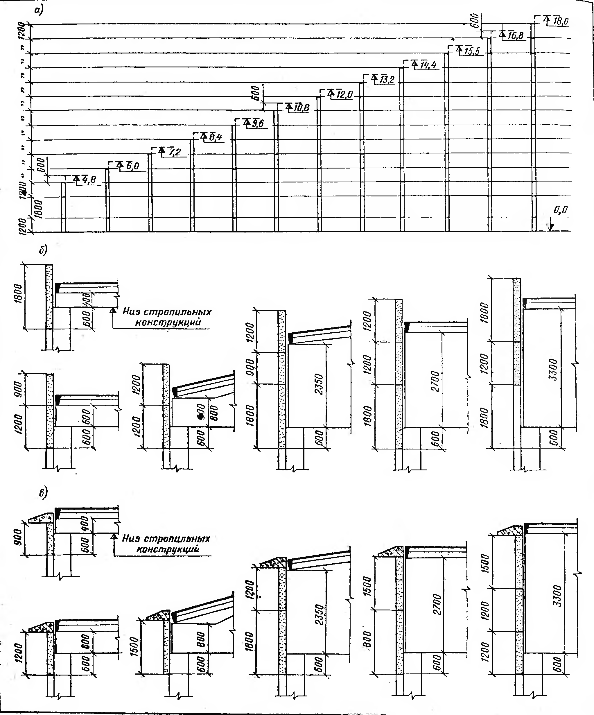 Стена из типовых железобетонных панелей делится по высоте условно на две части: нижнюю, до отметки на 600 мм ниже уровня низа стропильных конструкций покрытия, и верхнюю – выше этой отметки. Верхняя часть стены компонуется из панелей различной высоты в зависимости от высоты опорной части несущих конструкций покрытия и способа водоотвода. При внутреннем водоотводе стена завершается парапетом, а при наружном карнизом.
