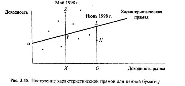 Рисунок показывает множество наблюдений за один месяц 1998 г. В отличие от ожидаемых значений (лежащих на характеристической прямой) на рис. 3.15 большинство значений отклоняются из-за влияния случайных, несистематических факторов. Например, точка 2 (общая доходность ценной бумаги на май 1998 г.) отражает превышение над доходностью, связанной с движением рынка XY, на величину нерыночной составляющей доходности YZ. Обратная ситуация наблюдалась в июне 1998 г. (точка H), когда фактическая доходность была ниже "предписываемой" по характеристической прямой.