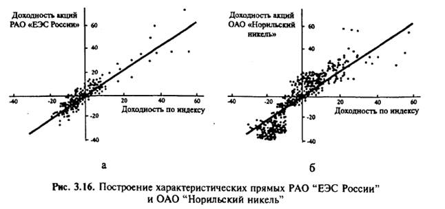 Пример построения характеристических прямых для двух российских эмитентов показан на рис. 3.16. В качестве индекса выбран индекс РТС, интервал наблюдений 15 календарных дней (10 торговых сессий), период 1996 г. - май 1998 г. По РАО "ЕЭС России". = 1,15; R2 = 0,8. По "Норильскому никелю". = 0,97; R = 0,66.