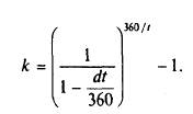 Истинная доходность к погашению k, или эффективная доходность, которую инвестор получает, вкладывая в дисконтную облигацию или дисконтный инструмент денежного рынка Р денежных единиц сегодня, рассчитывая на момент погашения через t дней получить номинал H, может быть оценена из уравнения Р ( 1 + k)1/360 = Н, где k — доходность к погашению, рассчитанная по правилу сложного процента. Эффективная годовая доходность отражает доход, который инвестор может иметь за год при условии реинвестирования полученных средств по действующей ставке. Это уравнение можно решить относительно k и выразить в терминах простой дисконтной доходности d и числа дней функционирования облигации: