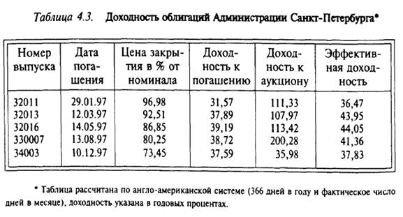 Включение в рассмотрение возможности реинвестирования обеспечивает в расчетах инвестора повышенную доходность. Чем больше период предполагаемого владения до погашения (t в днях), тем ближе значения доходности к погашению и эффективной доходности. Например, по данным биржевых u1090 торгов Санкт-Петербургской валютной биржи от 23 декабря 1996 г., по облигациям Администрации Санкт-Петербурга (ГГКО) расчет позволил получить значения доходности, приведенные в табл. 4.3.