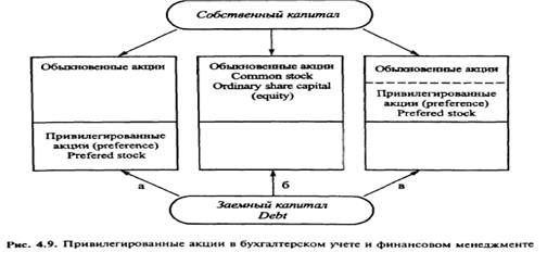 1. В бухгалтерской отчетности привилегированные акции относятся к акционерному капиталу, как показано на рис. 4.9в. В российской практике бухгалтерской отчетности (рис. 4.96) не выделяется величина капитала по привилегированным акциям в уставном капитале. В финансовом менеджменте принято относить привилегированные акции к заемному капиталу (рис. 4.9а), так как при фиксированности дивидендов этот элемент капитала является нагрузкой на получаемые денежные потоки (увеличивает финансовый рычаг и финансовый риск владельцев обыкновенных акций).