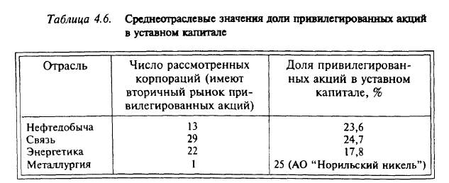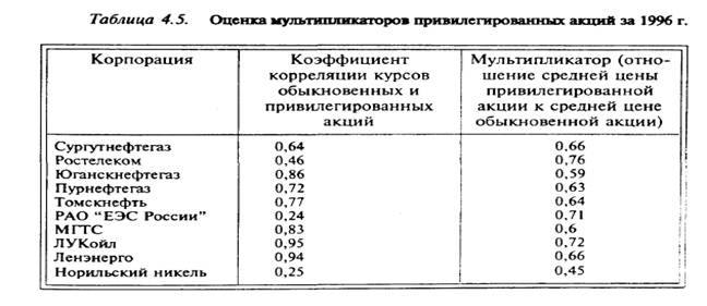 Модель исходит из высокой корреляции курсов обыкновенных и привилегированных акций одной корпорации. Например, за 1996 г. коэффициенты корреляции и мультипликаторы по российским компаниям приведены в табл. 4.5.