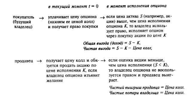Опцион, дающий его владельцу право купить актив, носит название ком-опцион (call option), а дающий право продать — пут-опцион (put option). Особенность опционов состоит в том, что они дают право, но не налагают обязательство, и владелец опциона имеет выбор: а) воспользоваться правом и купить акцию (т.е. исполнить колл-опцион) по фиксированной цене исполнения; б) не покупать акцию. Так как цена акции меняется во времени, то покупка по фиксированной цене может принести владельцу опциона денежный выигрыш, равный разности текущей цены акции на рынке и цены исполнения.