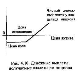 Рис. 4.10 показывает денежные выплаты, получаемые владельцем опциона (по опциону с правом покупки только в фиксированный день). Чистые выплаты (чистый денежный поток) отрицательны и равны цене колл, если цена акции S меньше, чем цена исполнения К. Если S > К, то общая выплата равна разнице между ценой акции и ценой исполнения. Чистая выгода (чистый денежный поток, получаемый владельцем) равна разнице между общей выплатой и ценой колл.