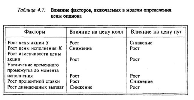 В табл. 4.7 показано влияние рассмотренных факторов на цену колл и цену пут.