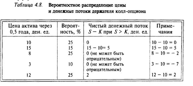 Покупка опциона дает дополнительные права владельцу, и за эти права имеет смысл заплатить, если владелец может рассчитывать на получение выгоды. Цена опциона должна быть не больше текущей оценки возможной чистой выгоды. Эта идея лежит в основе построения моделей ценообразования опционов. Рассмотрим оценку чистой выгоды инвестора на простом примере. Пусть инвестор оценивает покупку колл-опциона, который дает право купить или не купить актив через полгода по фиксированной цене 10 ден. ед. Актив рискованный, и значения возможной цены через полгода имеют вероятностное распределение, показанное в табл. 4.8.