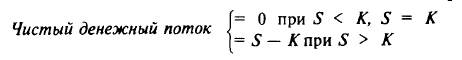 Ожидаемый чистый денежный поток = 0 х 0,25 + 5х0,15 + 0 х 0,25 + 0 х 0,1 + 2 х 0,25 =1,25. Этот поток будет получен инвестором через полгода. Текущая оценка чистого эффекта при непрерывном начислении процентной ставки равна 1,25е-kt. Если процентная ставка на рынке равна 10% (k = 0,1), то текущая оценка чистого денежного потока по опциону равна цене опциона и составляет 1,25е-0,1 x 0,5 = 1,25 х 0,951) = 1,19 ден. ед.