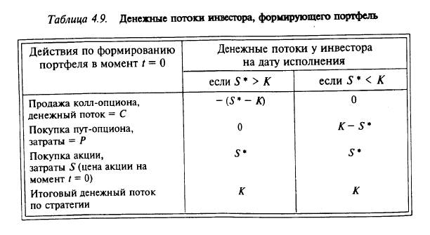 Так, текущий момент денежный поток инвестора равен S - С + Р (S — текущая цена акции, С - цена колл, Р — цена пут, С и P - искомые переменные в модели). При цене акции S* на дату исполнения инвестор с хеджированным портфелем имеет чистые выплаты, представленные в табл. 4.9.