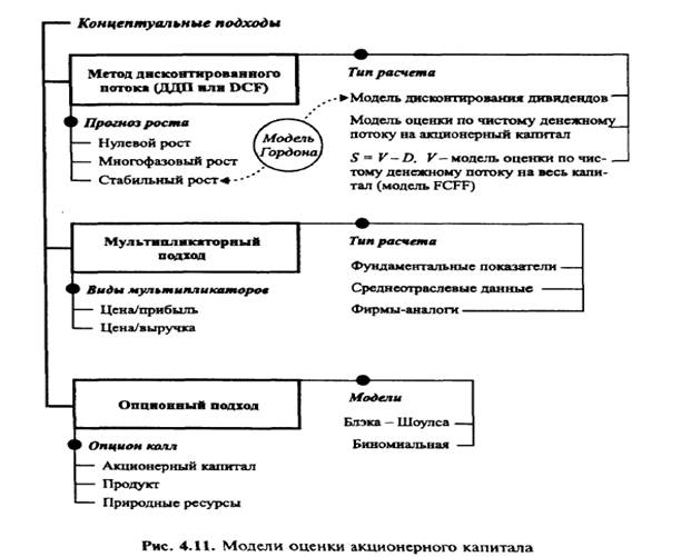 В зависимости от имеющейся информации и целей расчета в практике финансового менеджмента нашли применение несколько методов оценки акционерного капитала (рис. 4.11):