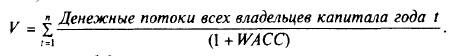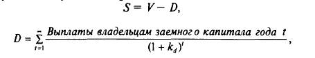 Эти потоки могут быть дисконтированы отдельно, и тогда рыночная оценка всего капитала (цена бизнеса) V равна сумме рыночной оценки акционерного капитала и привлеченного (заемного) V = S + D. Или в формуле дисконтированных денежных потоков ставкой дисконтирования должна быть средневзвешенная стоимость капитала корпорации k (k = WАСС).