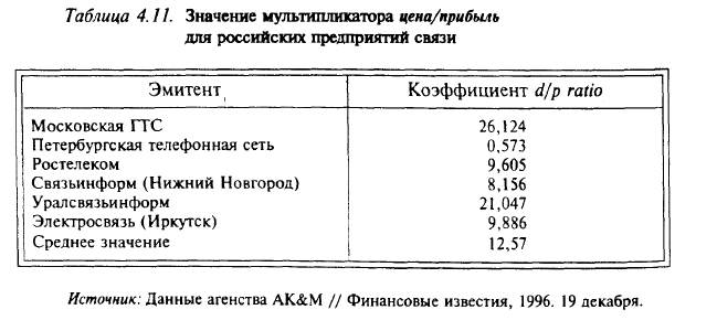 Рассчитанный мультипликатор может использоваться для оценки рыночной капитализации (но требует тщательного выбора группы сходных корпораций), а также для выдвижения гипотезы о недооцененности или переоцененности акций данной корпорации. При таком подходе требования к выбору фирм-аналогов менее жесткие. Например, сравнение российских корпораций с зарубежными может базироваться на выборе сходного направления деятельности и долгосрочной ставки процента. Наибольшее распространение получило сравнение коэффициента цена/прибыль со среднеотраслевым или среднерыночным по конкретной стране. Например, для российского рынка акций предприятий связи по данным на конец 1996 г. среднее значение коэффициента цена/прибыль составило 12,57 (табл. 4.11).