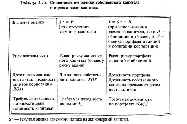 Оценка деятельности V рассчитывается на основе дисконтирования РСРР, где ставкой дисконтирования является стоимость капитала всей корпорации. Чистый денежный поток на весь капитал (FCFF) является потоком до выплат по заемному капиталу, поэтому на величину этого потока теоретически не влияет уровень финансового рычага. Влияние финансового рычага отражается в изменении стоимости капитала корпорации (степень его влияния на оценку V будет рассмотрена в гл. 5 "Управление структурой капитала".