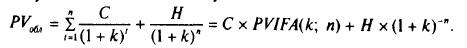 • Облигация рассматривается как долгосрочный финансовый актив, который выпускается корпорациями или государством (на федеральном или местном уровне). Цена продажи облигации и соответственно размер размещаемого займа (произведение цены на количество размещаемых облигаций), который привлекает эмитент, устанавливается в соответствии с обещаемыми платежами по облигации (по годовой купонной облигации это величина С), сроком функционирования п и номиналом Я. Текущая равновесная иена облигации может быть найдена как текущая оценка (РУ) будущих денежных поступлений по ней. Для купонной облигации с годовым купоном оценка рассчитывается как сумма текущей оценки аннуитета купонных платежей и текущей оценки номинала.