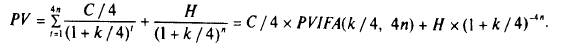 При многоразовом начислении купонного дохода увеличивается число периодов начисления процента. Например, при ежеквартальном начислении в размере С/4 текущая оценка составит
