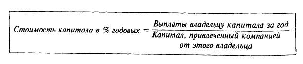 Относительная величина затрат по обслуживанию элементов капитала носит название стоимости капитала (cost of capital). Отдельные элементы капитала имеют различную стоимость. Эта стоимость отражается в относительных величинах как процентная ставка (годовые проценты).