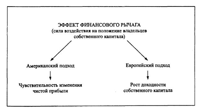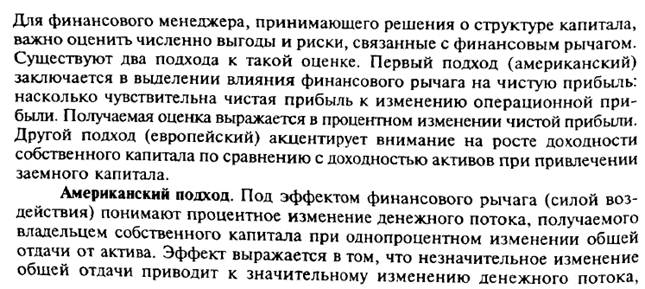 Европейский подход. Под эффектом финансового рычага понимается разница между доходностью собственного капитала и доходностью активов, т.е. дополнительная доходность у владельца собственного капитала, возникающая при привлечении заемного капитала с фиксированным процентом. Для рассмотренного выше примера эффект финансового рычага равен 25% - 14,3% = 10,7%.