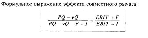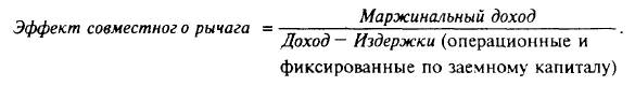 Эффект совместного рычага рассчитывается как произведение эффекта операционного рычага на эффект финансового рычага и показывает, на сколько процентов изменится чистая прибыль при изменении объема производства (реализационного дохода) на 1%.